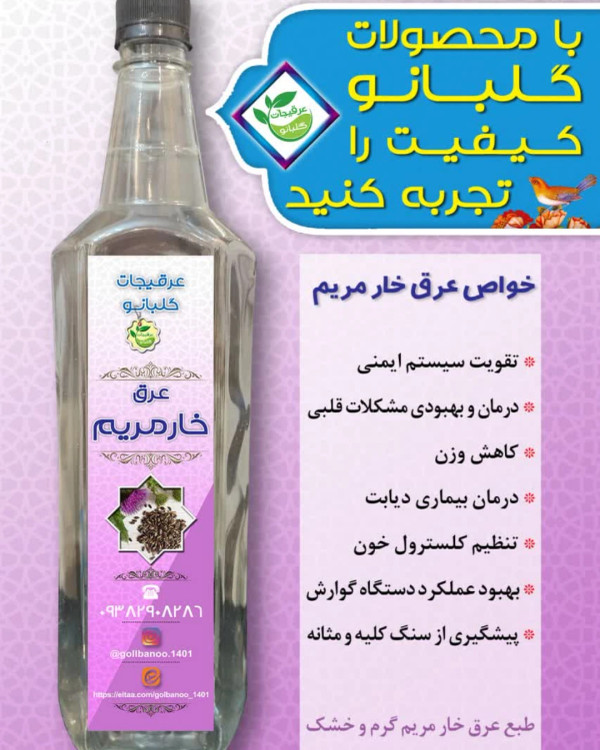 عرق خار مریم درجه یک قمصر کاشان گلبانو - 1 لیتر